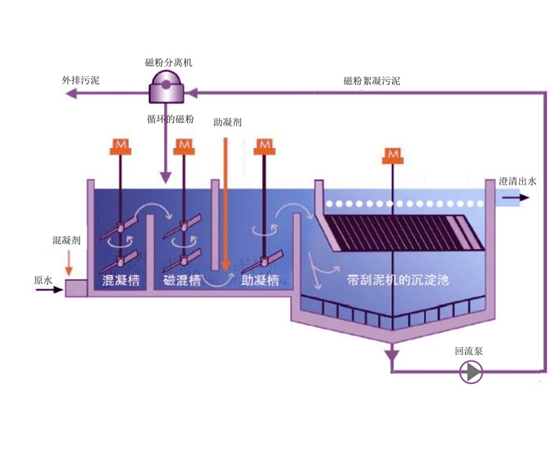磁混凝处理包括有主要设备有:T1-T2-T3混合池及搅拌机,沉淀池及刮泥机、回流及排泥泵,加药系统(包括PAC和PAM投加),磁粉回收设备(包括磁分离机和高剪机),自动控制系统。每一套磁混凝系统都是根据客户提供的具体数据设计。